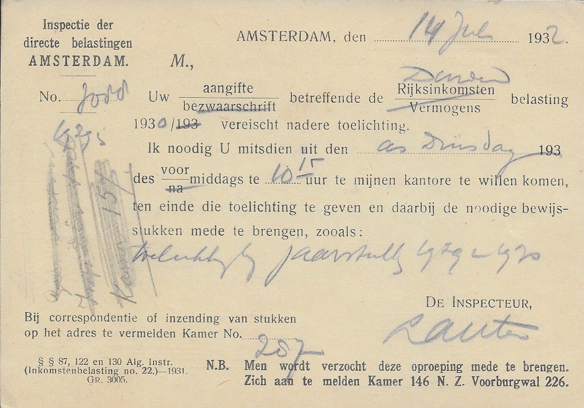 Op donderdag 14 juli 1932 schreef de Inspecteur dat ‘nadere toelichting vereischt was’ betreffende de Dividend belasting 1930. Hij nodigde het genoemde bedrijf uit om de dinsdag daarna op het kantoor te verschijnen om die toelichting te geven mét bewijsstukken, zoals de jaarrekeningen 1929 en 1930. Tot nu toe hebben we nog niet kunnen ontdekken wie of wat achter het bedrijf zat.