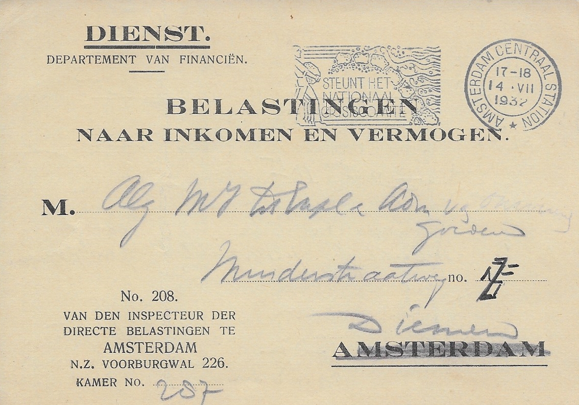 Een interessante kaart -met bekend klinkende tekst voor belastingplichtigen- uit 1932 van de Belastingdienst te Amsterdam naar de Alg(emeene) M(aatschapp)ij tot Expl(oitatie) van 〈Onroerende〉 Goederen aan de Muiderstraatweg in Diemen. De Belastingdienst was destijds gevestigd aan de Nieuwe Zijds Voorburgwal 226, achter het Koninklijk Paleis. Op de begane grond is tegenwoordig een supermarkt van Albert Heijn gevestigd.