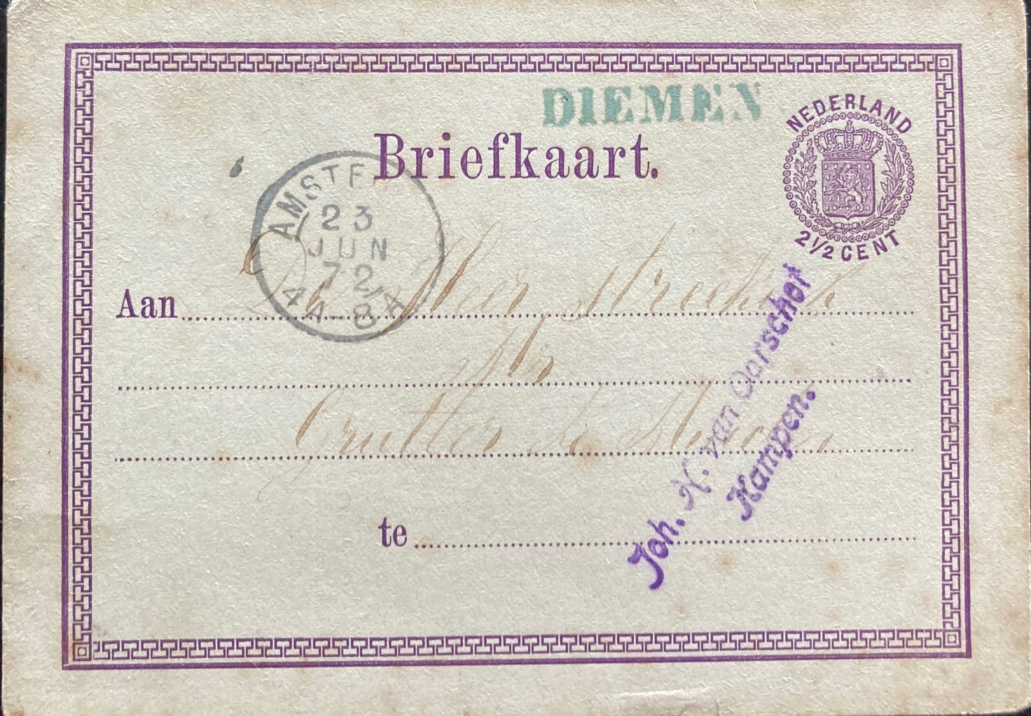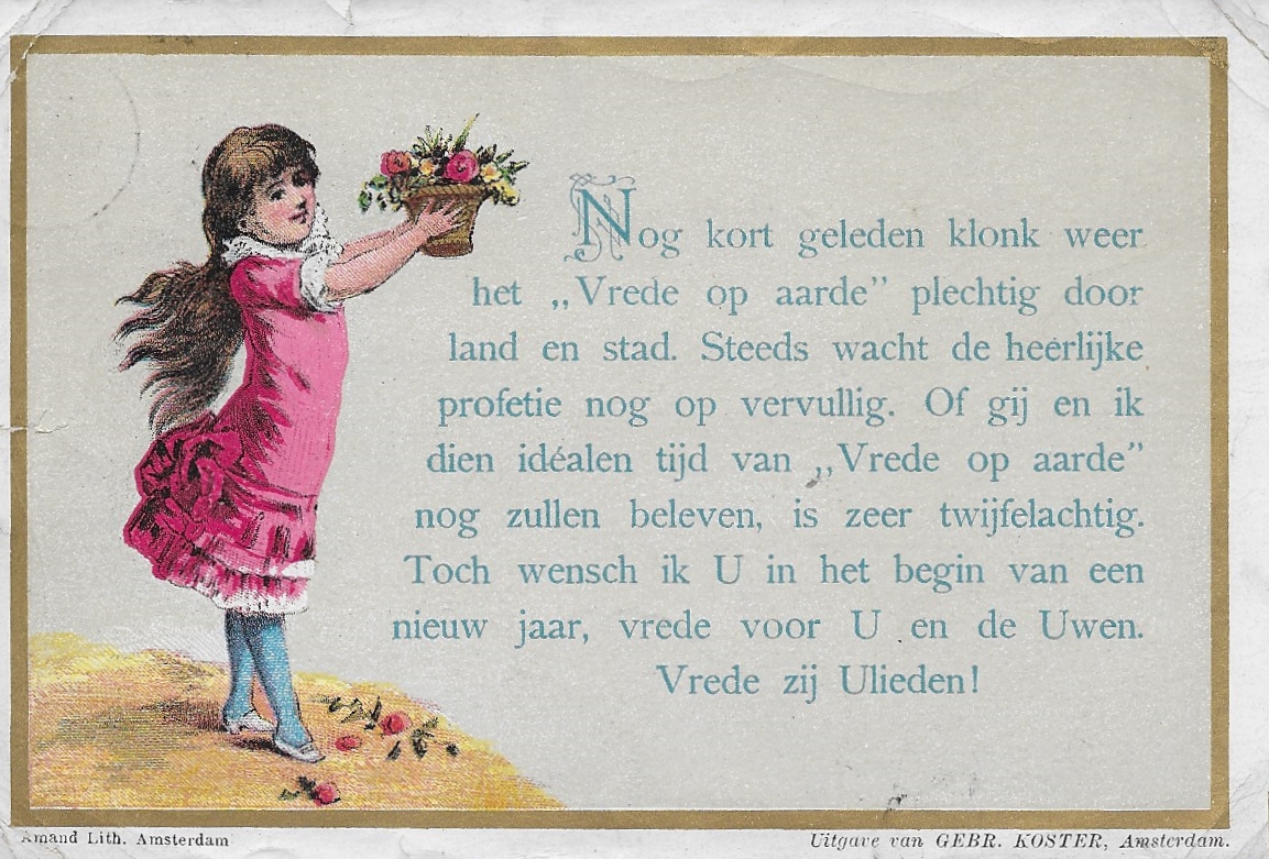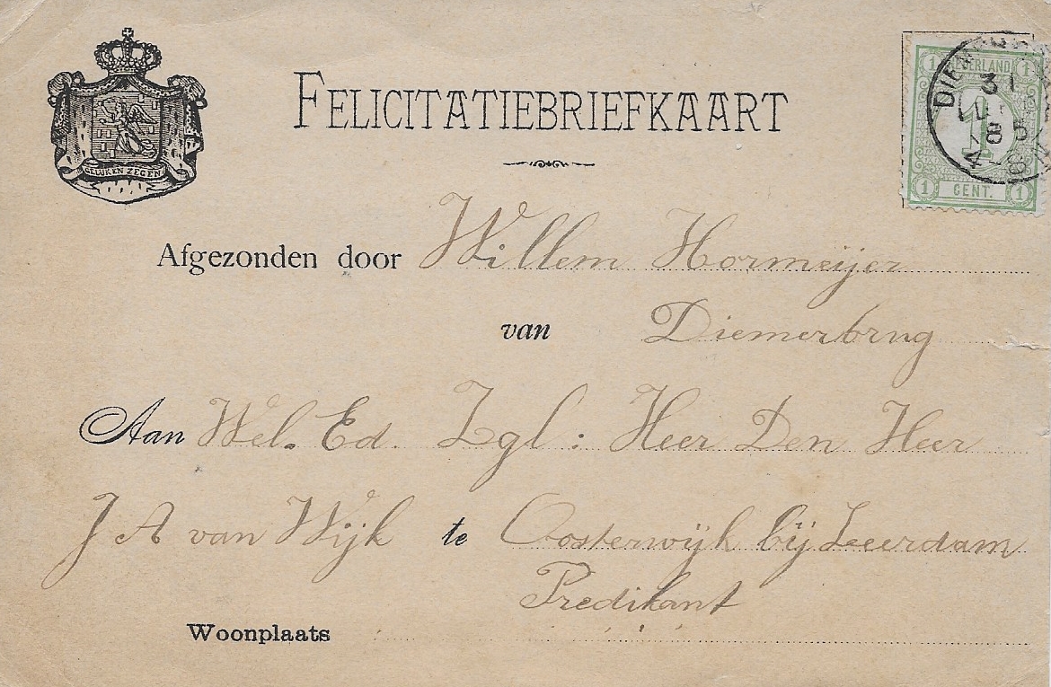 Het jaar 1870 geldt als het officiële geboortejaar van de picture postcard, maar 1889 is het jaar waarin deze de verbeelding van het publiek begon te vangen. Begin jaren 1890 ontwikkelden Duitse uitgevers een chromolithografisch drukproces, waarmee ze hoogwaardige, meerkleurige kaarten konden maken, wat het gebruik van ansichtkaarten verder stimuleerde. Hieronder een vanuit Diemen verstuurde felicitatiebriefkaart met gekleurde afbeelding naar Oosterwijk uit 1885.