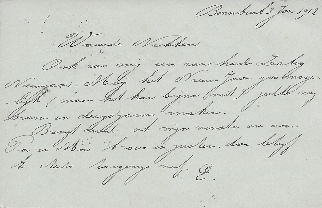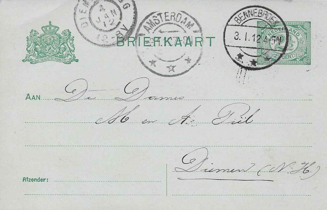 Een nieuwjaarswens uit het jaar 1912 van Bennebroek naar Diemen. Het meest opvallend is dat deze briefkaart is geadresseerd aan de dames M. en A. Piël te Diemen (N.H.). Een adres van deze dames is niet vermeld. De verzender ging er kennelijk van uit dat de postbestellers in Diemen wel op de hoogte zouden zijn van het woonadres van deze dames. Zo ging dat kennelijk nog in die tijd. Diemen was klein en iedereen wist waar iedereen woonde.