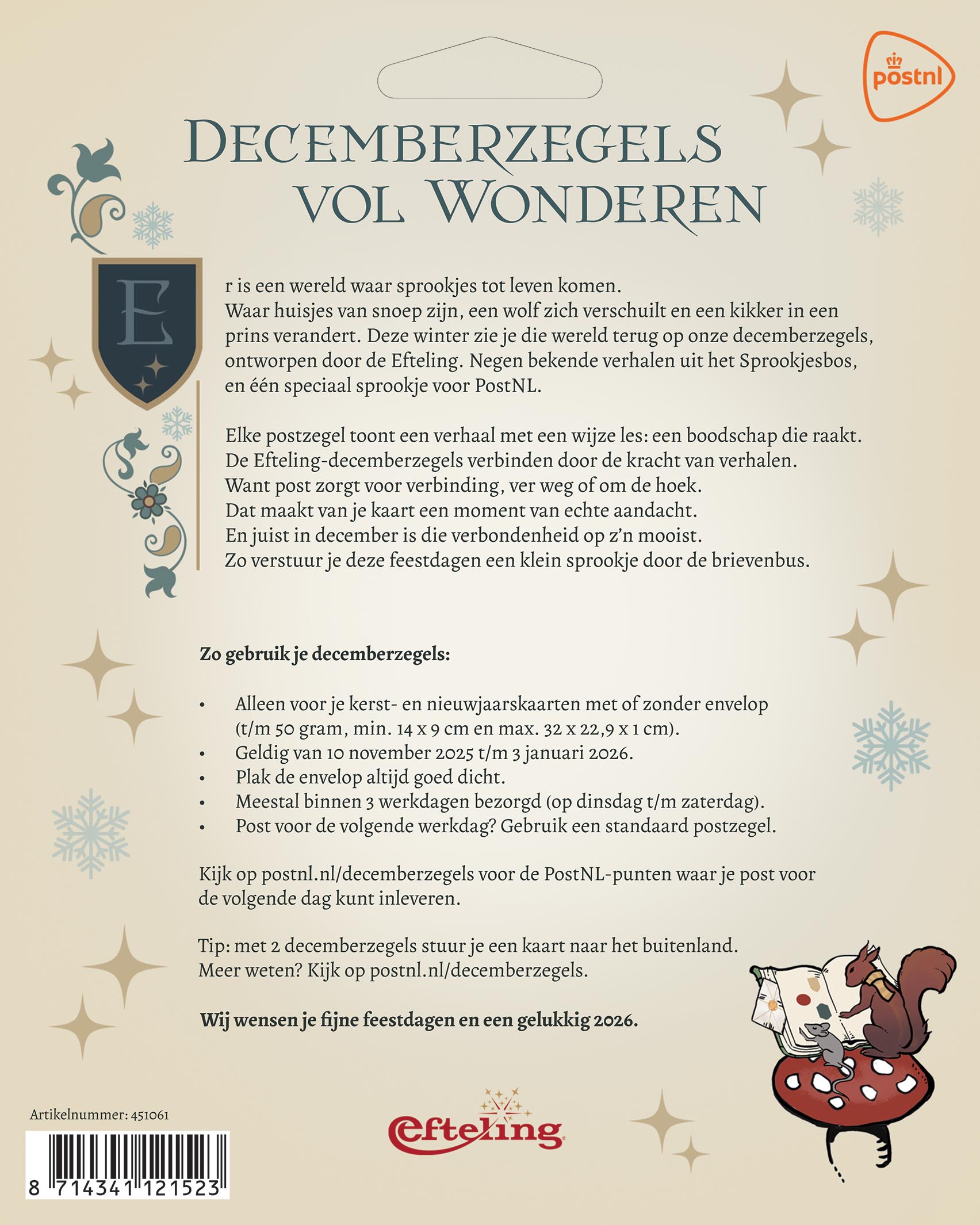 Elk jaar brengt PostNL nieuwe decemberzegels uit waarmee consumenten en bedrijven elkaar tegen een voordelig tarief kerst- en nieuwjaarskaarten kunnen sturen. Het speciale decembertarief van € 1,21 per postzegel is geldig van 10 november 2025 tot en met 3 januari 2026. Een vel met 20 decemberzegels kost dit jaar € 24,20. Bij aanschaf van 2 vellen decemberzegels in de winkel ontvangt iedere klant als cadeau een uniek sprookjesboek met daarin de 10 sprookjes die op het decemberzegelvel staan afgebeeld. De illustraties op de decemberzegels van dit jaar zijn gemaakt door ontwerper Sander de Bruijn van de Efteling. Hij was ook verantwoordelijk voor het ontwerp van het sprookjesboek.