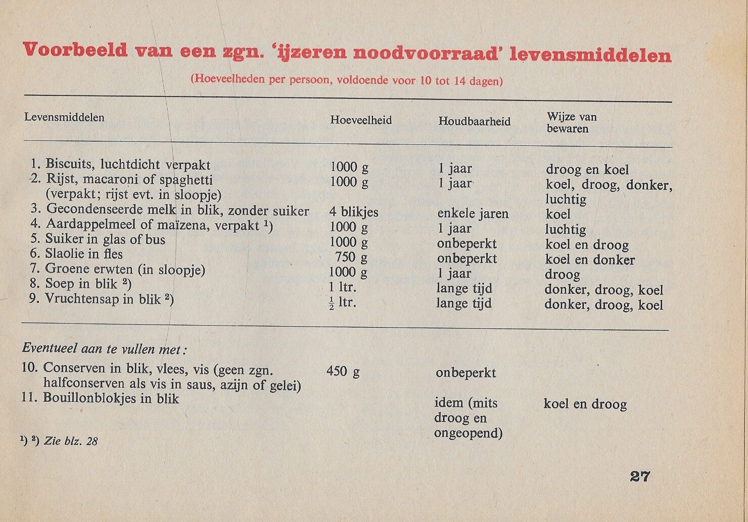 In de toelichting op de Wenken was wel een voorbeeld opgenomen van een ‘ijzeren noodvoorraad’ levensmiddelen voor 10 tot 14 dagen. Tegenwoordig wordt een noodvoorraad voor 72 uur aanbevolen.