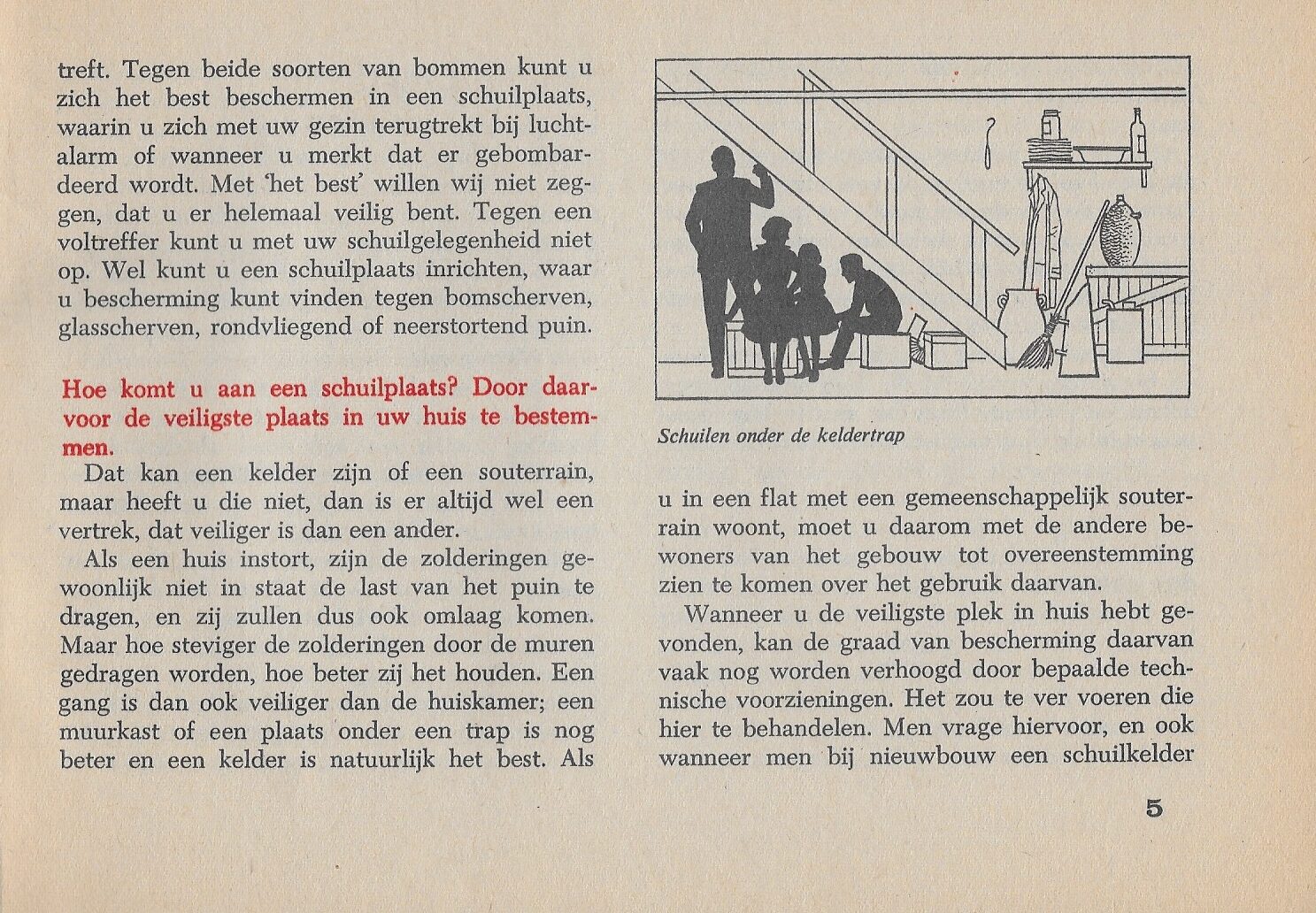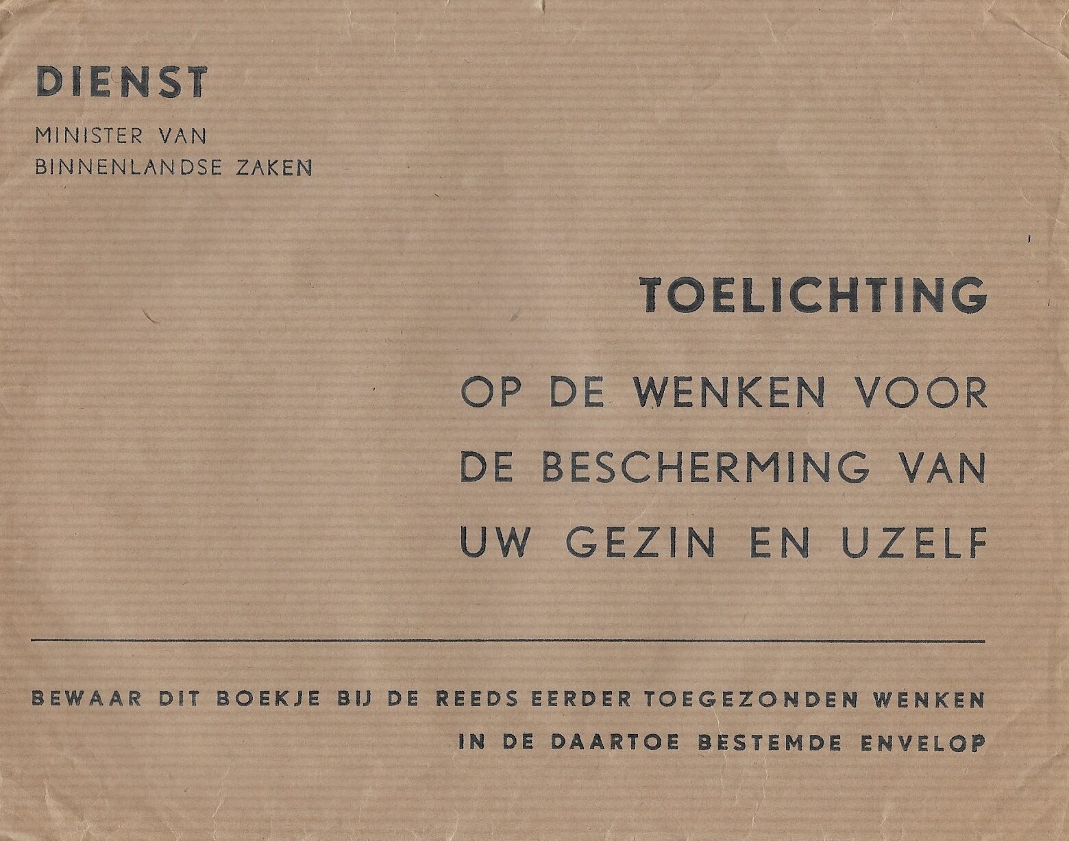 Enkele weken later werd ook een toelichting op de Wenken verspreid. Het was een brochure met een rode kaft. Op 30 pagina’s was alles te lezen over bombardementen, atoombommen, fallout en bescherming, maar maakte ook duidelijk dat men zich niet al te veel illusies moest maken: ‘Reken er echter niet te vast op dat u tijdig door luchtalarm wordt gewaarschuwd. Als het kernwapen met een raket aankomt, is dit zelfs onmogelijk. Het is in dit geval dus waarschijnlijk dat de explosie op een voor u volkomen onverwacht moment plaatsvindt. Maar dan krijgt u (…) nog de waarschuwing van de lichtflits, want die komt één tot enkele seconden voor de luchtdruk. Dat is zeker niet veel tijd, maar wel nog voldoende om onder een tafel, in een portiek of een greppel, of achter een boom te duiken…’