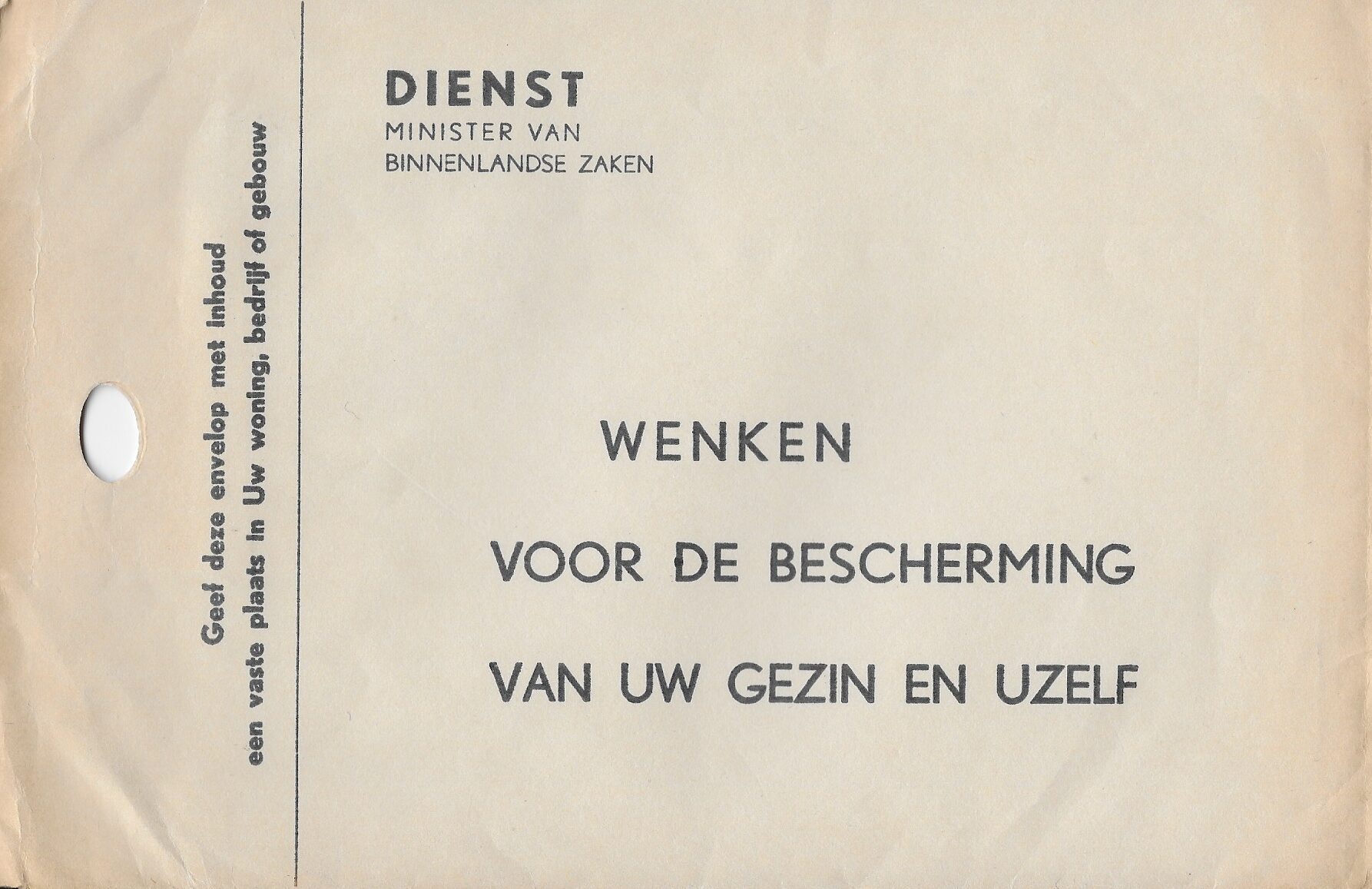 In oktober 1961 ontving iedereen in Nederland per dienstbrief van het Ministerie van Binnenlandse Zaken de brochure ‘Wenken voor de Bescherming van uw gezin en uzelf’. De brochure was afkomstig van Bescherming Bevolking (de BB), een in 1952 opgerichte dienst van het ministerie van Binnenlandse Zaken, die burgers bij oorlogsdreiging moest beschermen. In de folder werd informatie gegeven over hoe men zich het beste kon beschermen bij eventuele bombardementen, ontploffingen van atoombommen en radioactieve neerslag.