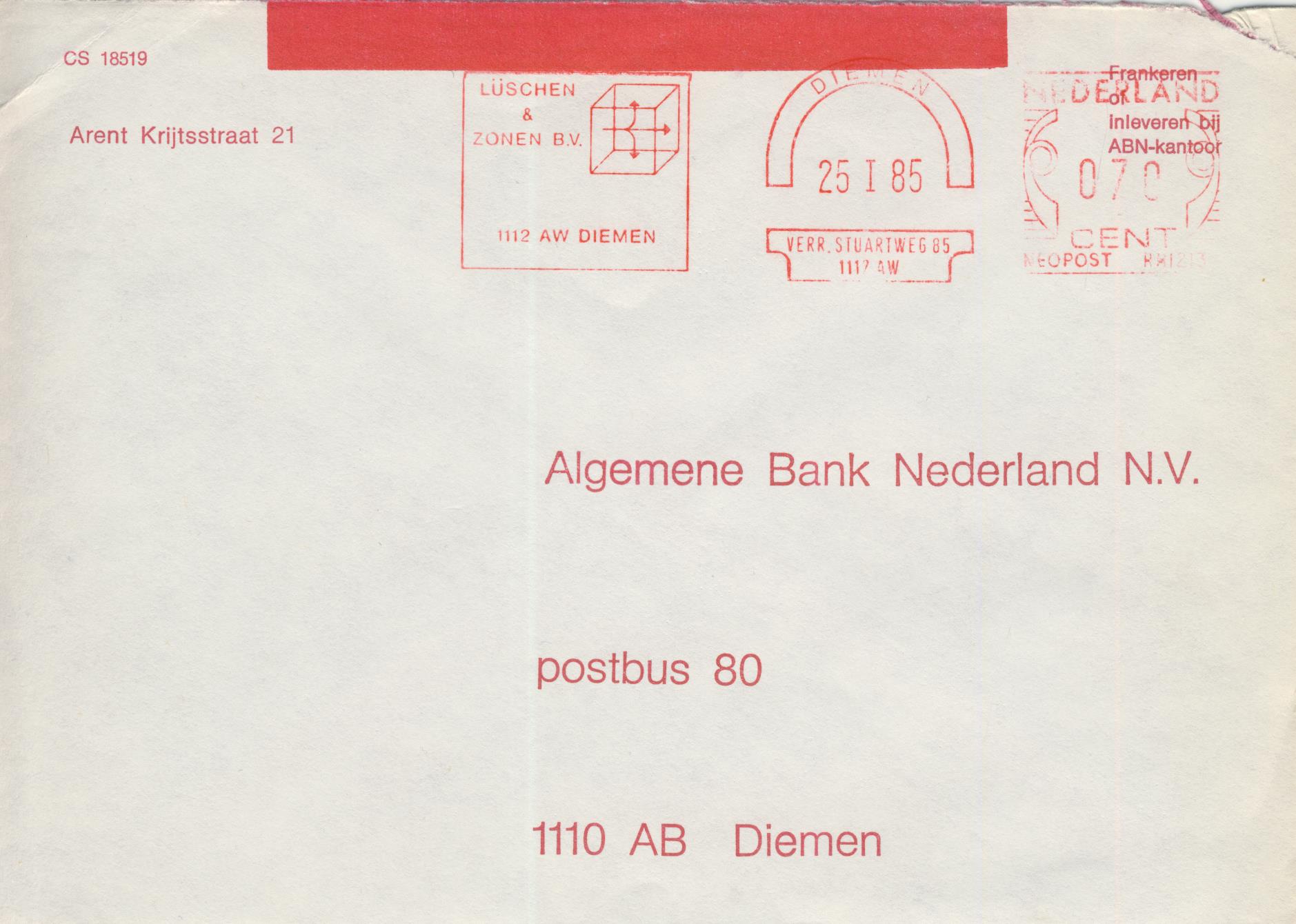Het frankeerstempel van dit poststuk is van de firma Lüschen & Zonen, gevestigd aan de Verrijn Stuartweg 85 in Diemen. De geschiedenis van dit stukadoorsbedrijf gaat terug tot 1621, toen de eerste familieleden als Duitse gastarbeiders naar Amsterdam kwamen om het ambacht uit te oefenen. Generatie na generatie is het vakmanschap doorgegeven en verfijnd. Het bedrijf heeft zicht gespecialiseerd in traditioneel stukadoorswerk en werkte vaak voor NV Stadsherstel en Monumentenzorg in Amsterdam, aan grachtenpanden, winkelpanden en banken. Vandaag de dag heeft Lüschen vestigingen in Diemen, Almere en Weesp.